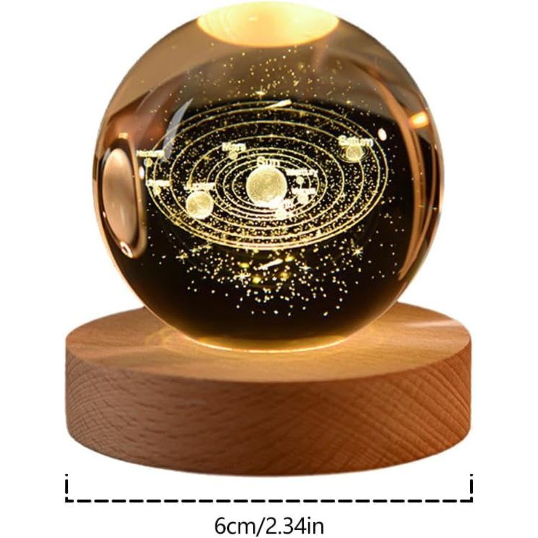 Durante el día, el cristal K9 ultra claro muestra con detalle el sistema solar grabado en 3D. Por la noche, su luz cálida ilumina cada planeta, creando un ambiente acogedor y lleno de encanto.